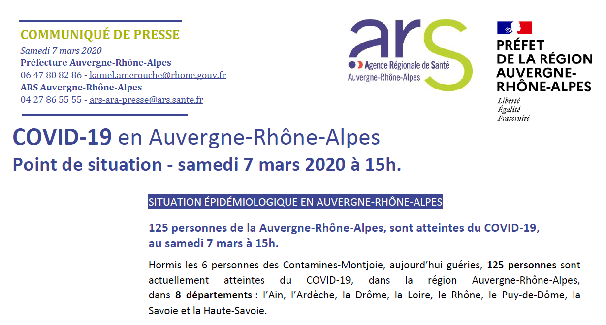 Mar72020Crise sanitaire (covid-19)Télécharger le point de situation épidémiologique en Auvergne-Rhône-Alpes par l’ARS au samedi 07 mars 2020 à 15h. Navigation articlePrécédent Article précédent :Covid-19 : point de situation au 06 mars en Auvergne-Rhône-Alpes par l’ARSSuivantArticle suivant :Coronavirus : le gouvernement veut répondre aux interrogations des élusRelated postsLe COVID-19 n’a pas disparu, ensemble restons prudents22 août 2022Aucun test ne pourra être exigé pour participer aux opérations de vote les 10 et 24 avril30 mars 2022Covid19 Mesures pour les écoles, collèges et lycées : modalités pratiques, continuité pédagogique et protocole sanitaire17 mars 2022À partir d’aujourd’hui, le port du masque n’est plus obligatoire en intérieur14 mars 2022Protocole sanitaire : de nouveaux allègements dans les écoles14 mars 2022Ce que contient le décret qui lève la plupart des restrictions sanitaires14 mars 2022